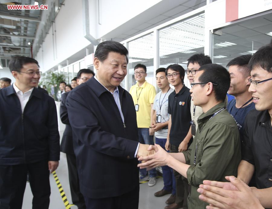 Chinese President Xi Jinping (C) shakes hands with workers at the technology center of Shanghai Automotive Industry Corp. (SAIC MOTOR) during his inspection in Shanghai, east China, May 24, 2014. Xi Jinping made an inspection tour to Shanghai from Friday to Saturday. (Xinhua/Lan Hongguang)