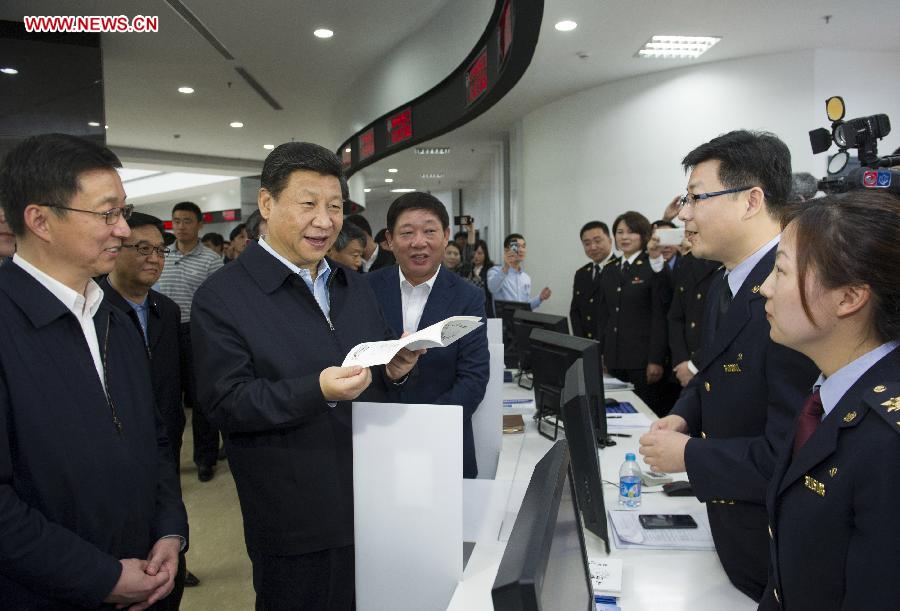 Chinese President Xi Jinping (2nd L) talks with workers at Waigaoqiao comprehensive service hall of the China (Shanghai) Pilot Free Trade Zone (FTZ) during his inspection in Shanghai, east China, May 23, 2014. Xi Jinping made an inspection tour to Shanghai from Friday to Saturday. (Xinhua/Huang Jingwen)