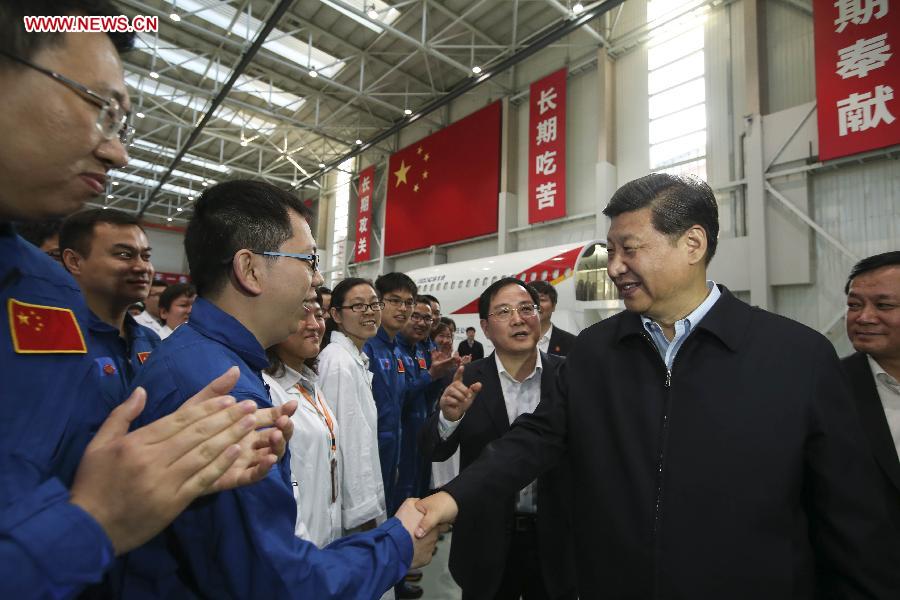 Chinese President Xi Jinping (1st R) shakes hands with engineers at the design and research center of Commercial Aircraft Corporation of China (COMAC) during his inspection in Shanghai, east China, May 23, 2014. Xi Jinping made an inspection tour to Shanghai from Friday to Saturday. (Xinhua/Lan Hongguang)