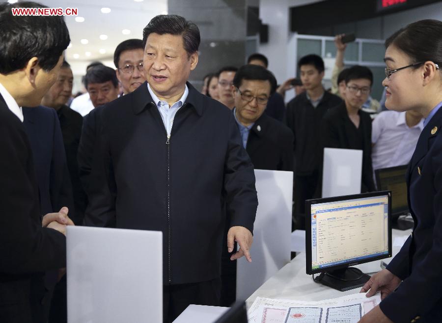 Chinese President Xi Jinping (C) talks with workers at Waigaoqiao comprehensive service hall of the China (Shanghai) Pilot Free Trade Zone (FTZ) during his inspection in Shanghai, east China, May 23, 2014. Xi Jinping made an inspection tour to Shanghai from Friday to Saturday. (Xinhua/Lan Hongguang)