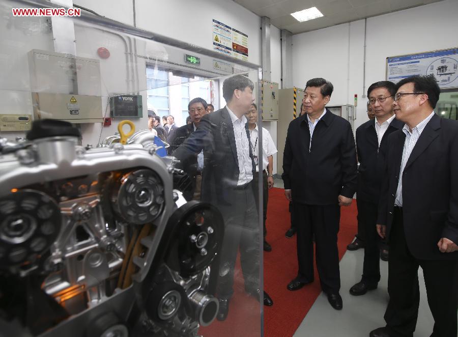 Chinese President Xi Jinping (C) visits the technology center of Shanghai Automotive Industry Corp. (SAIC MOTOR) during his inspection in Shanghai, east China, May 24, 2014. Xi Jinping made an inspection tour to Shanghai from Friday to Saturday. (Xinhua/Lan Hongguang)