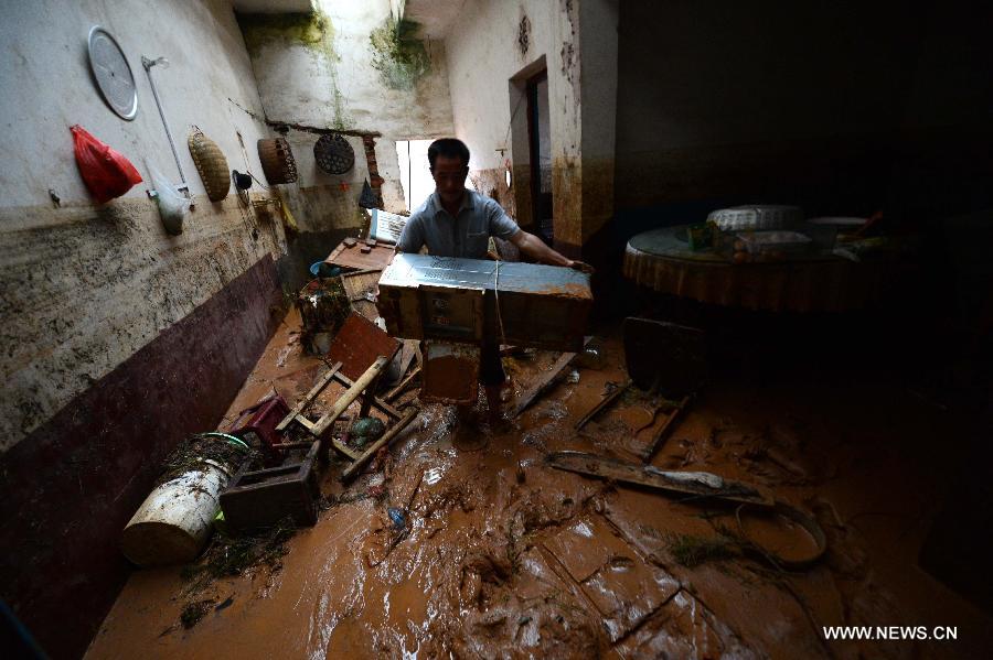 A villager clears his house after a flood at Chengchong Village in Shangli County, east China's Jiangxi Province, May 25, 2014. Heavy rainstorms hit Shangli since Saturday, causing two deaths and forcing the relocation of around 84,500 people. (Xinhua/Zhou Ke)