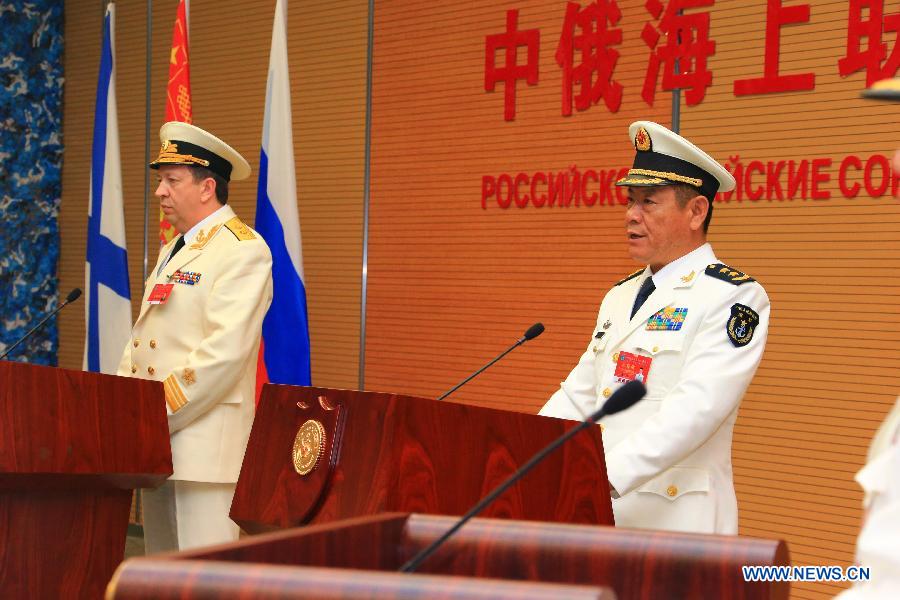 Tian Zhong (R), deputy commander of the Chinese Navy and the Chinese director of the "Joint Sea-2014", addresses the closing ceremony of the China-Russia joint naval drill in Shanghai, east China, May 26, 2014. The directors of two sides announced the end of the drill here on Monday. (Xinhua/Zha Chunming)