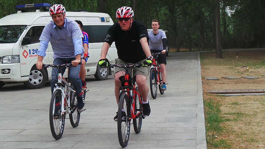 Danish Ambassador Friis Arne Petersen (L) takes part in the “Climate Race” with participants from local bicycle clubs in Beijing Yeya Lake National Wetland Park in Yanqing north of Beijing on May 24, 2014. (People’s Daily Online/Kong Defang)