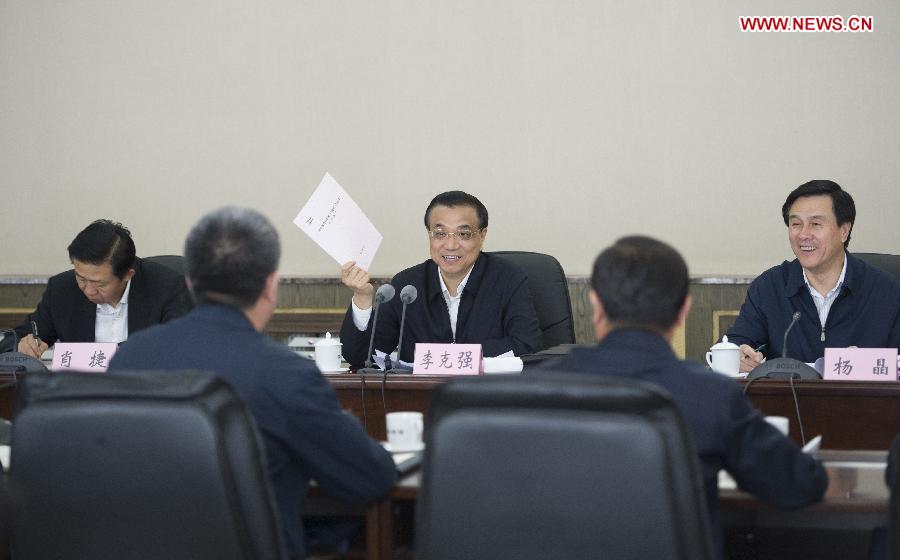 Chinese Premier Li Keqiang (C, back), also a member of the Standing Committee of the Political Bureau of the Communist Party of China (CPC) Central Committee, attends a meeting of the standing members of the local Party committee for the "mass line" educational campaign, in Ongniud Qi, north China's Inner Mongolia Autonomous Region, May 23, 2014. The Communist Party of China (CPC) initiated the year-long campaign in June, 2013 to strengthen the "mass line", referring to a guideline under which the CPC is required to prioritize the interests of the people. (Xinhua/Xie Huanchi)