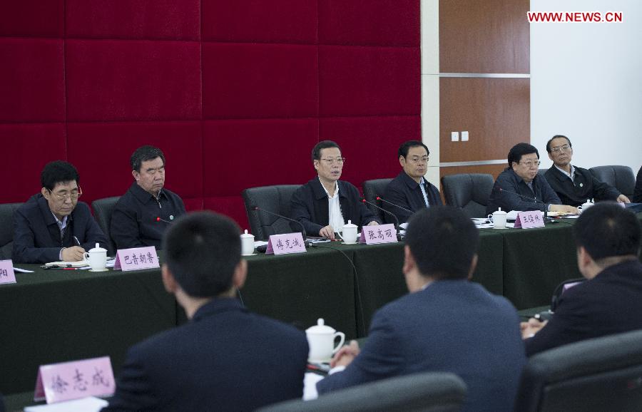 Chinese Vice Premier Zhang Gaoli (C, back), also a member of the Standing Committee of the Political Bureau of the Communist Party of China Central Committee, attends a meeting of the standing members of the local Party committee for the "mass line" educational campaign, in Nongan County, northeast China's Jilin Province, May 19, 2014. The Communist Party of China (CPC) initiated the year-long campaign in June, 2013 to strengthen the "mass line", referring to a guideline under which the CPC is required to prioritize the interests of the people. (Xinhua/Wang Ye)