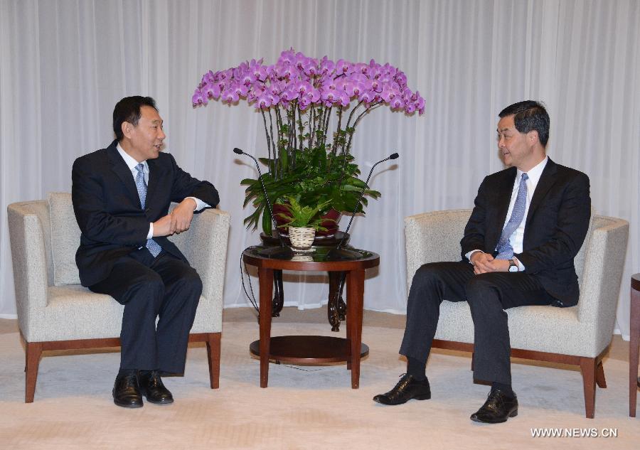 | Hong Kong Chief Executive Leung Chun-ying (R) meets with Zhang Yong, head of the China Food and Drug Administration, in Hong Kong, south China, May 26, 2014.(Xinhua) |
