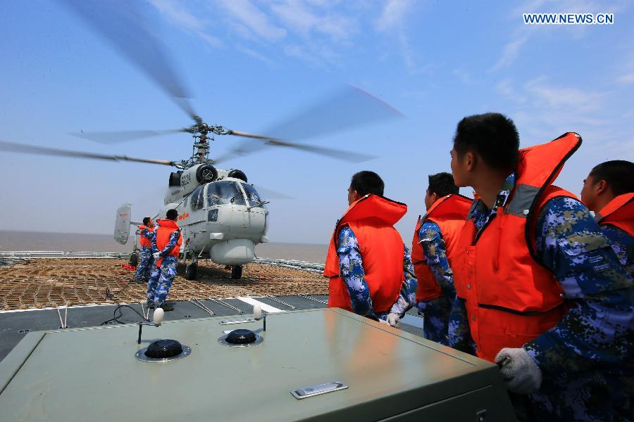 Crew members wash the engine of a helicopter on China's Zhengzhou missile destroyer, East China Sea, May 22, 2014. Naval ships from China and Russia left Shanghai for the East China Sea to take part in the "Joint Sea-2014" exercise on Thursday. (Xinhua/Zha Chunming)