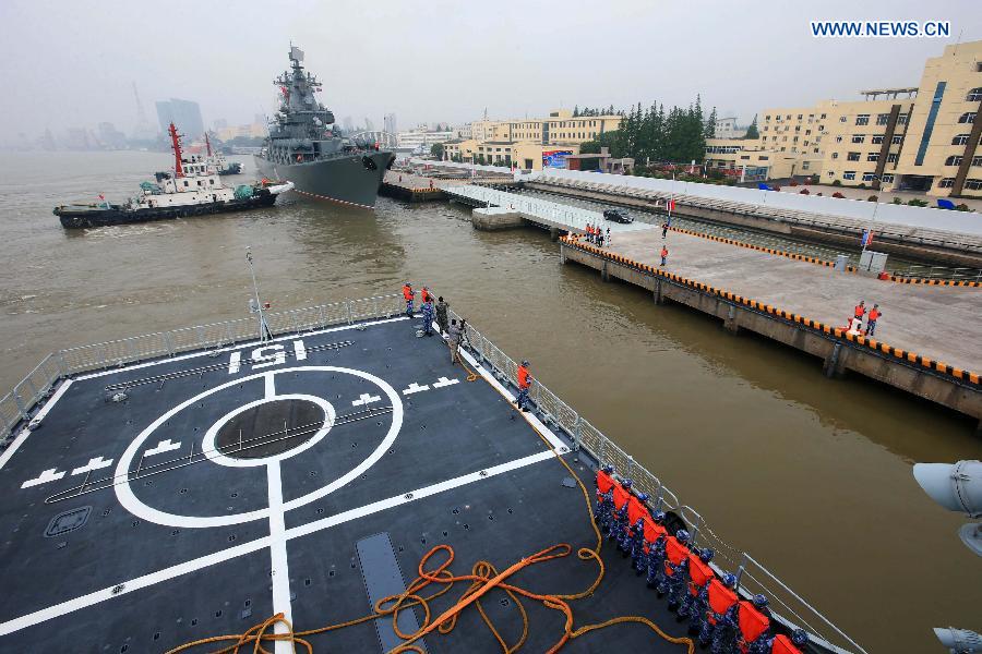 China's Zhengzhou missile destroyer (bottom) leaves a military harbor in Shanghai, east China, May 22, 2014. Naval ships from China and Russia left Shanghai for the East China Sea to take part in the "Joint Sea-2014" exercise on Thursday. (Xinhua/Zha Chunming)