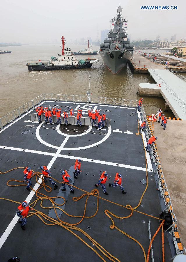 China's Zhengzhou missile destroyer (bottom) leaves a military harbor in Shanghai, east China, May 22, 2014. Naval ships from China and Russia left Shanghai for the East China Sea to take part in the "Joint Sea-2014" exercise on Thursday. (Xinhua/Zha Chunming)