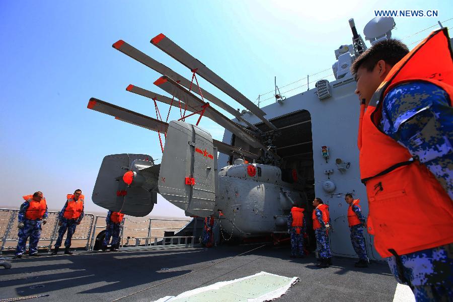 A helicopter enters a hangar on China's Zhengzhou missile destroyer, East China Sea, May 22, 2014. Naval ships from China and Russia left Shanghai for the East China Sea to take part in the "Joint Sea-2014" exercise on Thursday. (Xinhua/Zha Chunming)