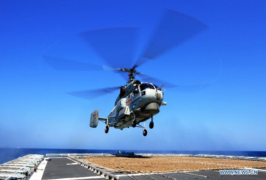 A Chinese navy helicopter takes off from China's Zhengzhou missile destroyer during the China-Russia joint naval drill on East China Sea, May 24, 2014. The three-day drill "Joint Sea-2014" ended successfully on Saturday. The Chinese and Russian navies staged exercises, including joint escort drill, joint aircraft identification exercise and air defense and maritime assault drills. (Xinhua/Zha Chunming)