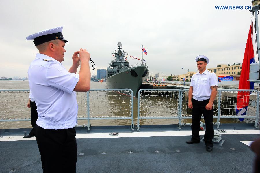 Soldiers of Russian guided missile cruiser Varyag take pictures while visiting China's missile destroyer Zhengzhou in Shanghai, east China, May 19, 2014. Chinese and Russian naval forces held interchange activities on Monday to enhance mutual communication. (Xinhua/Zha Chunming)