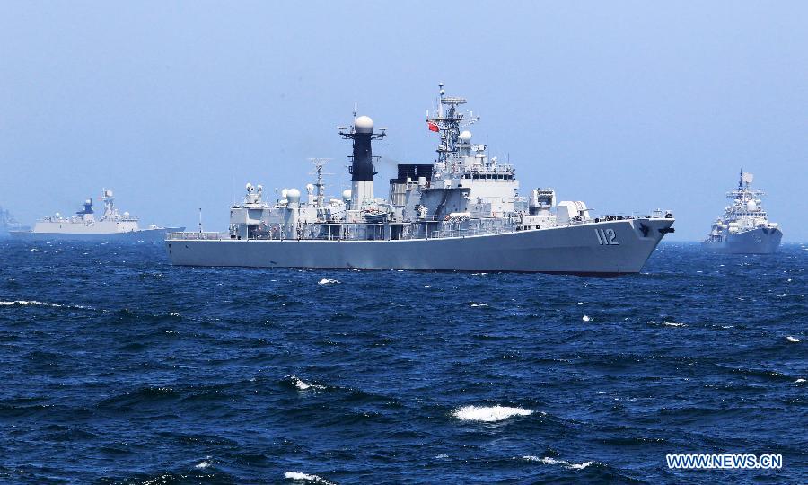 | Chinese and Russian vessels gather at designated sea area during the China-Russia joint naval drill on East China Sea, May 24, 2014. The three-day drill "Joint Sea-2014" ended successfully on Saturday. The Chinese and Russian navies staged exercises, including joint escort drill, joint aircraft identification exercise and air defense and maritime assault drills. (Xinhua/Zha Chunming) |