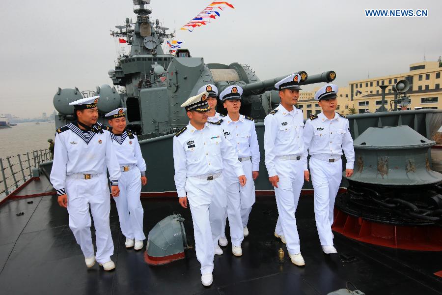 Soldiers of China's missile destroyer Zhengzhou visits Russian guided missile cruiser Varyag in Shanghai, east China, May 19, 2014. Chinese and Russian naval forces held interchange activities on Monday to enhance mutual communication. (Xinhua/Zha Chunming)