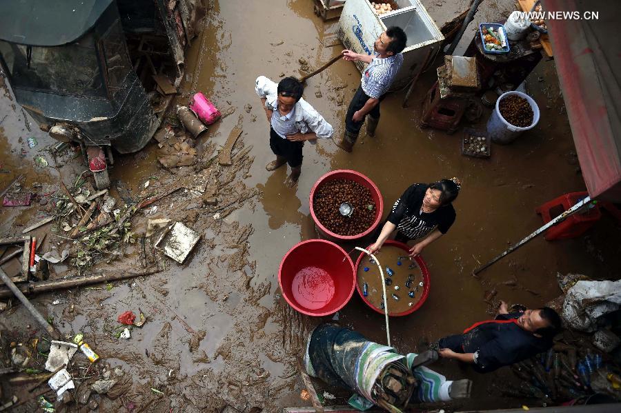 A flood withdraws from a farmer's market in Chenjiafang Town, Shaoyang County, central China's Hunan Province, May 26, 2014. Hunan issued the red alert of floods on May 25 as continuous downpours hit many parts of the province. A total of 400,000 people were affected and 16,776 displaced with the collapse of 520 houses. (Xinhua/Li Ga)