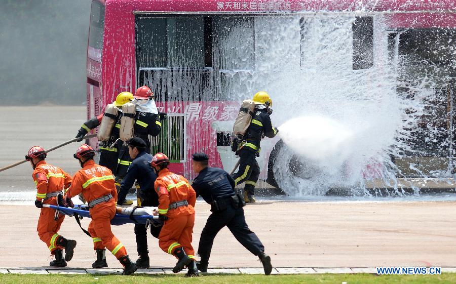 Firemen attend an anti-terrorism drill in Shaoxing, east China's Zhejiang Province, May 27, 2014. Police of Zhejiang Province held an anti-terror drill on Tuesday.(Xinhua/Wang Dingchang)