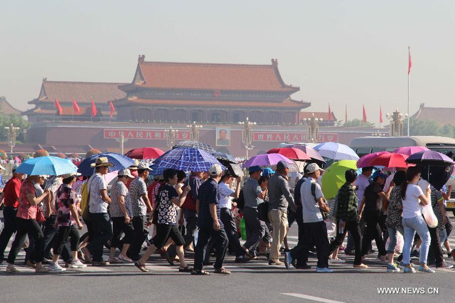 People use their sunshades and hats to block the sun when visiting the Tian'anmen Square in Beijing, capital of China, May 28, 2014. The city's meteorological department issued this year's first yellow alert for heat Tuesday. (Xinhua/Wang Yueling)