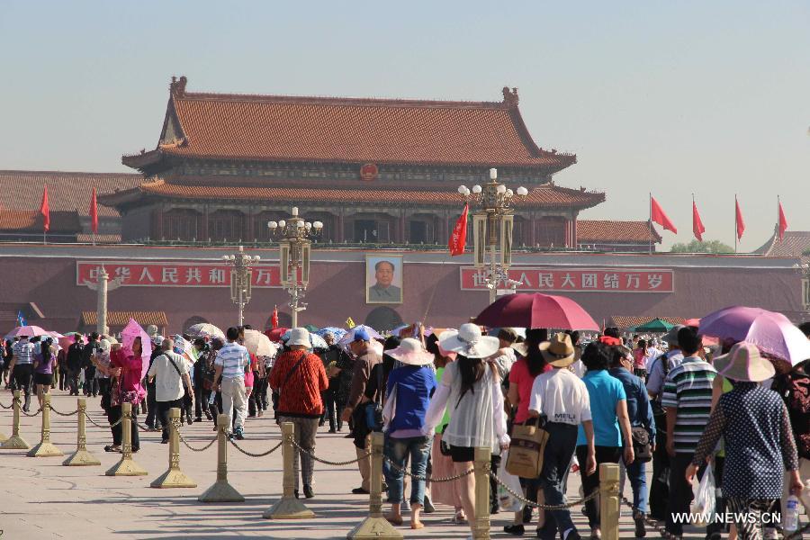 People use their sunshades and hats to block the sun when visiting the Tian'anmen Square in Beijing, capital of China, May 28, 2014. The city's meteorological department issued this year's first yellow alert for heat Tuesday. (Xinhua/Wang Yueling)
