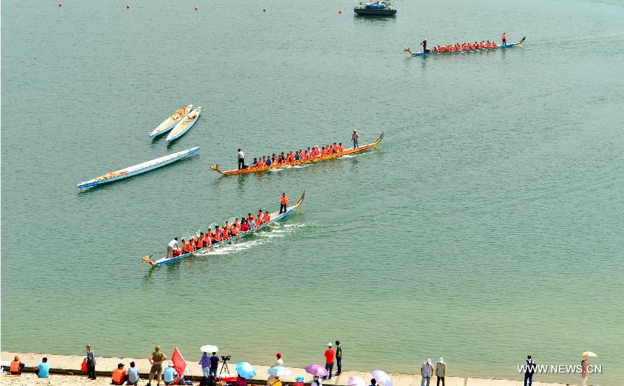Participants paddle in a practice for dragon boat race ahead of the Dragon Boat Festival in Zigui County of Yichang City, central China's Hubei Province, May 28, 2014. The Dragon Boat Festival, which falls on June 2 this year, is believed to be designed to commemorate the death of Qu Yuan, a patriot poet during the Warring State Period (475-221 BC). As the festival approaches, people in Zigui County, hometown of Qu Yuan, have prepared various activities including hanging mugwort leaves, holding dragon boat races and making Zongzi, a pyramid-shaped dumpling made of glutinous rice wrapped in bamboo or reed leaves, for celebrations. (Xinhua/Zheng Jiayu)
