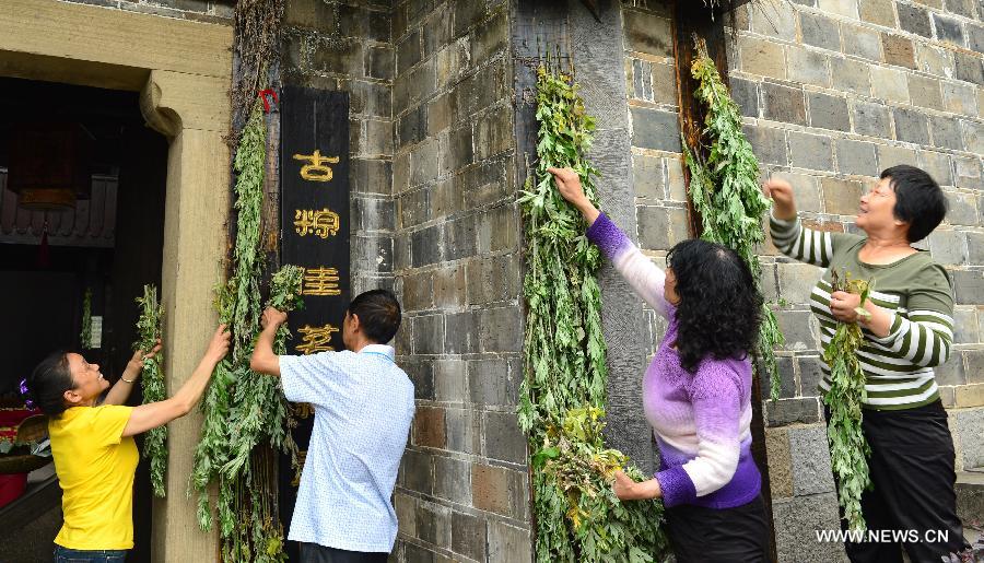 People hang mugwort leaves at the entrance of their house ahead of the Dragon Boat Festival in Zigui County of Yichang City, central China's Hubei Province, May 28, 2014. The Dragon Boat Festival, which falls on June 2 this year, is believed to be designed to commemorate the death of Qu Yuan, a patriot poet during the Warring State Period (475-221 BC). As the festival approaches, people in Zigui County, hometown of Qu Yuan, have prepared various activities including hanging mugwort leaves, holding dragon boat races and making Zongzi, a pyramid-shaped dumpling made of glutinous rice wrapped in bamboo or reed leaves, for celebrations. (Xinhua/Zheng Jiayu)