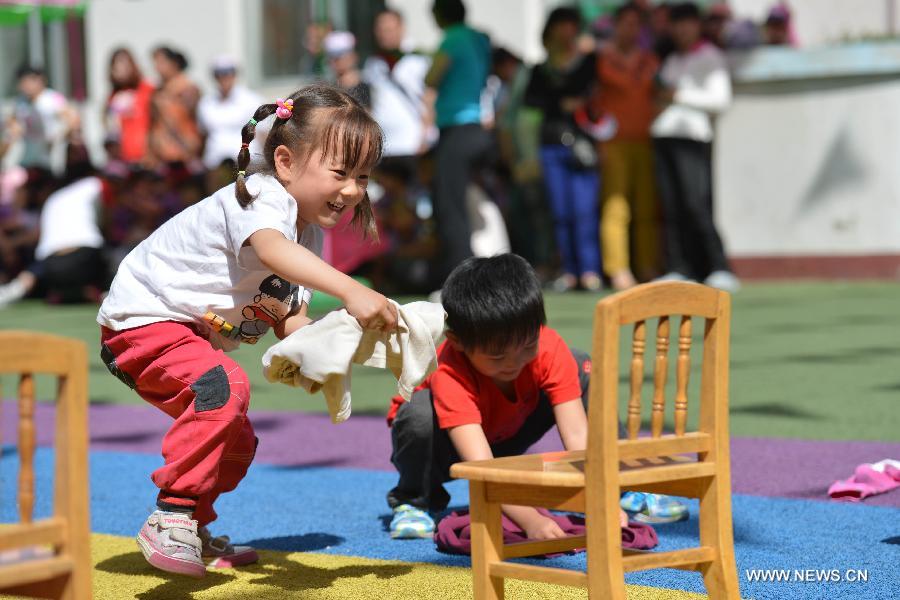Children compete in folding clothes to celebrate the upcoming Children's Day in Hohhot, capital of north China's Inner Mongolia Autonomous Region, May 28, 2014. (Xinhua/Wang Zheng)