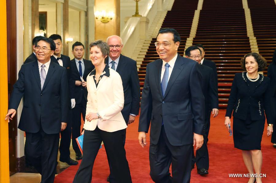 | Chinese Premier Li Keqiang (R, front) enters the venue for the opening ceremony of the Annual Meeting of the Global Research Council in Beijing, capital of China, May 27, 2014. (Xinhua/Yao Dawei) |