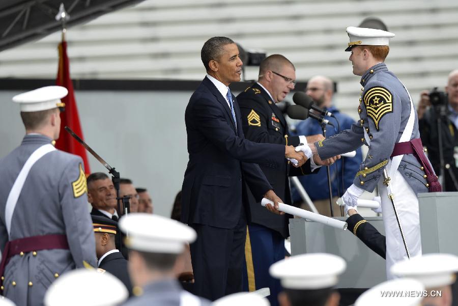 U.S. President Barack Obama (C) delivers a diploma to a member of the 2014 graduating class during the graduation ceremony at the United States Military Academy at West Point, New York, the United States, on May 28, 2014. Obama said here Wednesday that he believes in the foreseeable future, terrorism remains the most direct threat to America at home and abroad. (Xinhua/Wang Lei)