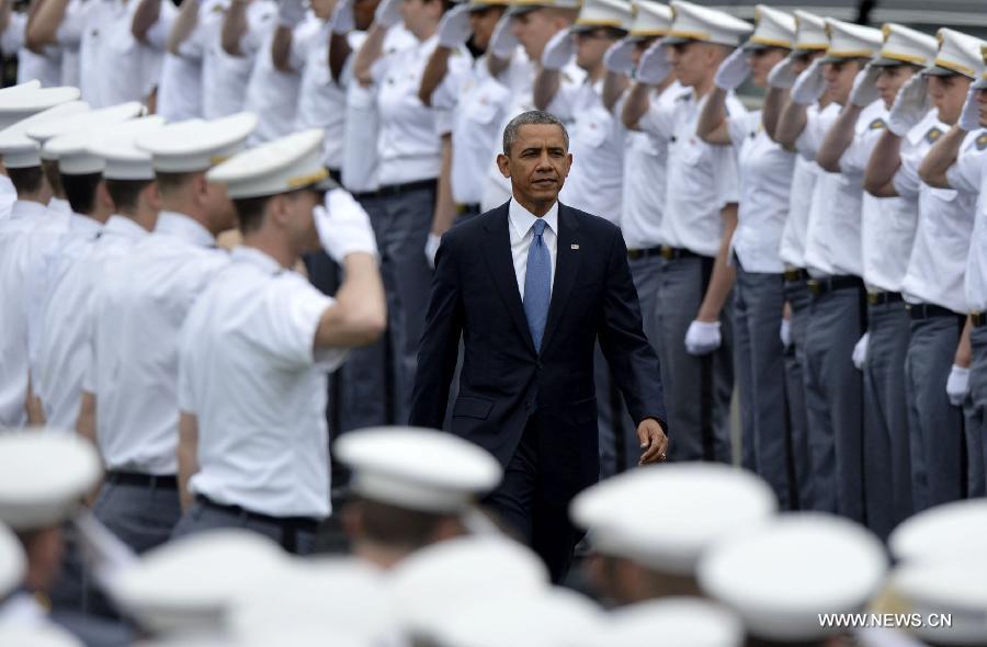 U.S. President Barack Obama (C) attends the graduation ceremony at the United States Military Academy at West Point, New York, the United States, on May 28, 2014. Obama said here Wednesday that he believes in the foreseeable future, terrorism remains the most direct threat to America at home and abroad. (Xinhua/Wang Lei)