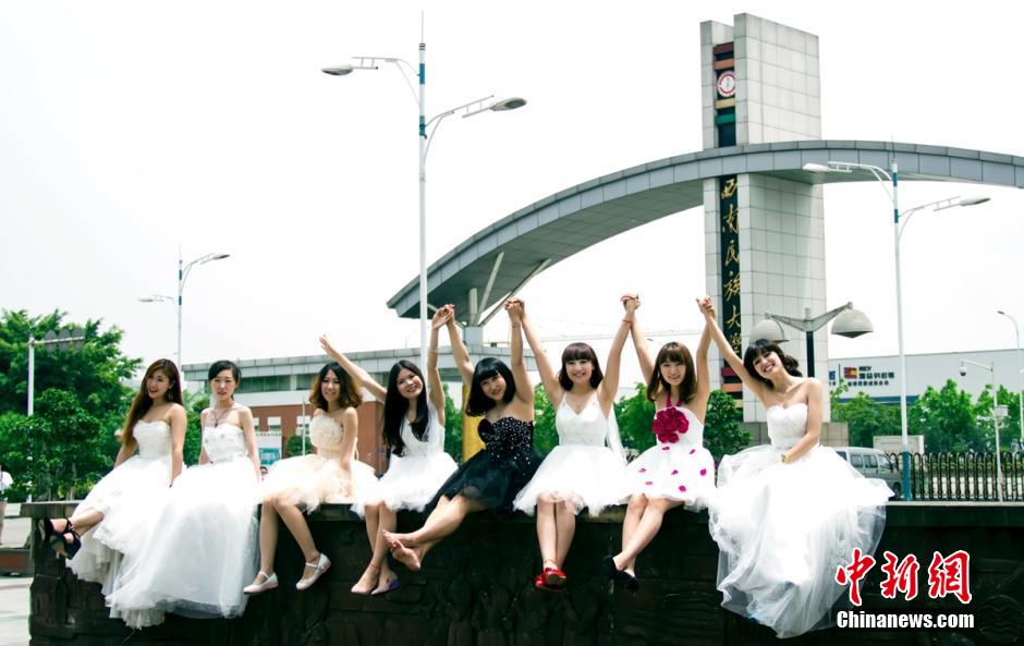 College students from Southwest University for Nationalities pose for group photos to mark their graduation on May 28, 2014. (CNS/Huang Guobing)