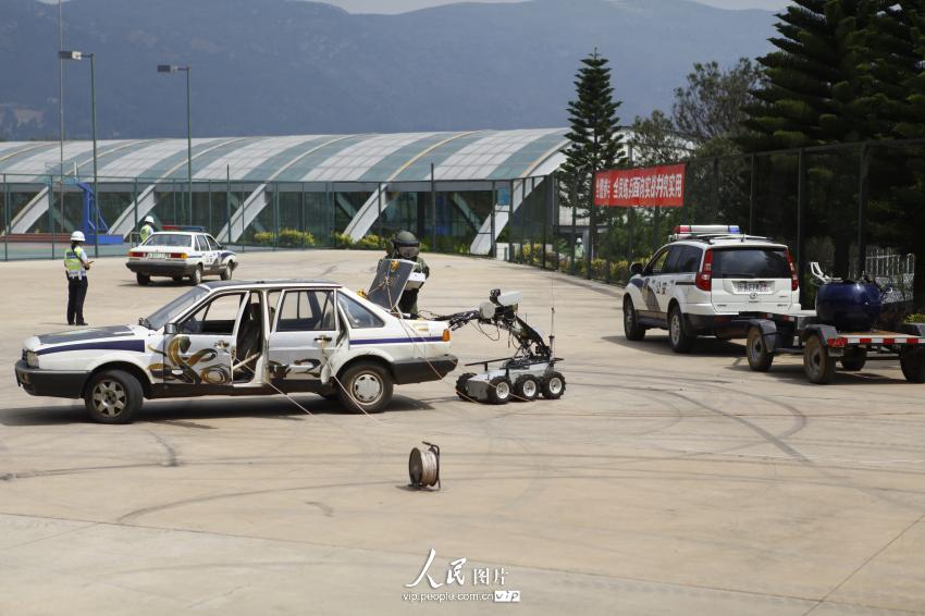 Simulation: EOD personnel operate the robot to remove the explosive device from the car.(vip.people.com.cn/Li Faxing)