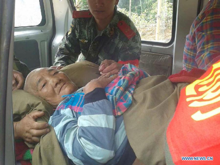 An injured elder received medical treatment after a 6.1-magnitude earthquake in Longdong Village of Kachang Township in Yingjiang County, southwest China's Yunnan Province, May 30, 2014. A 6.1-magnitude earthquake hit Yingjiang County at 9:20 a.m. Beijing Time (0120 GMT) Friday, according to the China Earthquake Networks Center. The epicenter was in Yingjiang County, the Dai-Jingpo Autonomous Prefecture of Dehong. It was measured at 25 degrees north latitude and 97.8 degrees east longitude, at a depth of 12 km, according to the center. (Xinhua/Hao Yaxin)