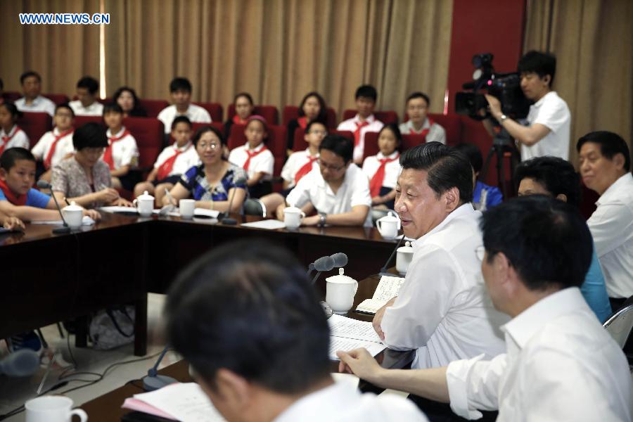 Chinese President Xi Jinping attends a seminar with representatives from teachers, students and parents during his visit at Beijing Haidian National Primary School in Beijing, capital of China, May 30, 2014. Xi attended an activity to celebrate the upcoming International Children's Day at the primary school. (Xinhua/Ju Peng)