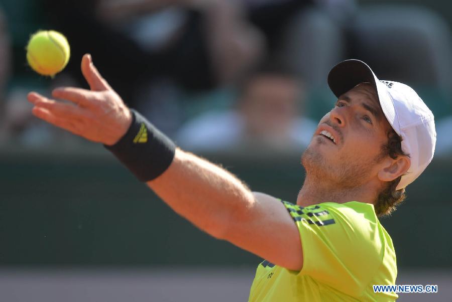 Andy Murray of Britain serves during the men's singles third round match against Germany's Philipp Kohlschreiber at the French Open in Paris, France, on May 31, 2014. The match was suspended in the fifth set for the onset of darkness. (Xinhua/Chen Xiaowei)