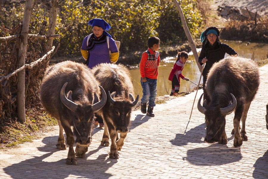 Going Home (bronze): Farmers in Yuanyang, Yunnan province, head home with their children and buffaloes in February 2014. Gao Tian'ai, 17, Beijing (Photo/ China Daily)