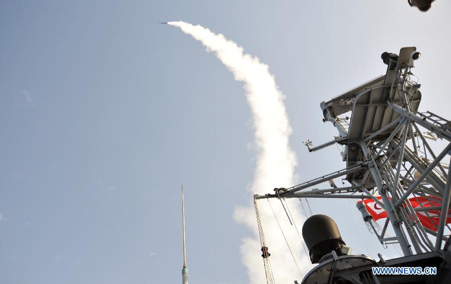 A warship launches missile in a military drill in the Mediterranean Sea in Turkey, on May 31, 2014. Turkish Naval Forces launched a large-scale and wide-range military drill with the code name of White Storm-2014 in southwestern province of Antalya's Mediterranean Sea district. The training process will continue until June 1. (Xinhua/Cihan)