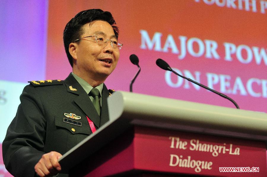 Wang Guanzhong, deputy chief of the General Staff of the Chinese People's Liberation Army, speaks during the fourth plenary session of the 13th Shangri-La Dialogue in Singapore June 1, 2014, the final day of the multilateral forum focusing on security issues in Asia. (Xinhua/Then Chih Wey)