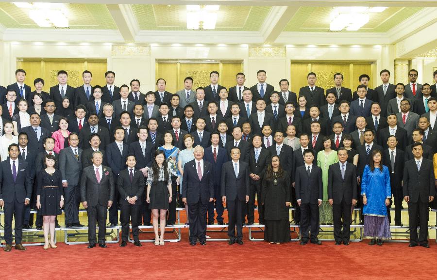 Chinese Premier Li Keqiang (6th R front) and Malaysian Prime Minister Najib Razak (6th L front) meet with representatives of youth from both China and Malaysia before the celebration of the 40th anniversary of the establishment of diplomatic relations between China and Malaysia in Beijing, capital of China, May 31, 2014. (Xinhua/Wang Ye)