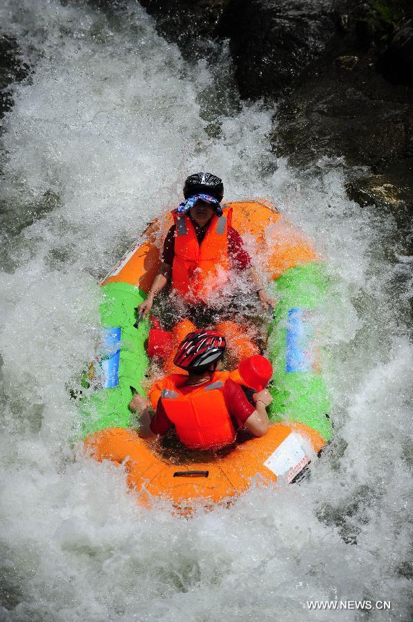 Tourists drift by rafts at the Chaotianhou scenery spot in Xingshan County, central China's Hubei Province, June 1, 2014, the second day of the Dragon Boat Festival holiday. By drifting down the stream, tourists could enjoy the beautiful landscape in the scenery spot. (Xinhua/Du Huaju)