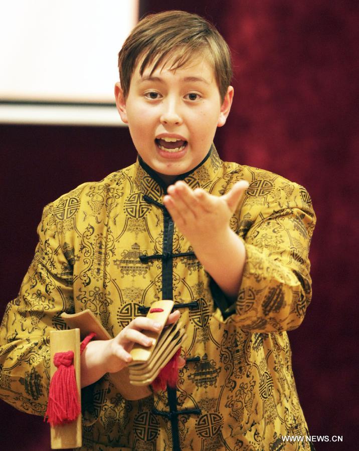 A student of a local Chinese language school performs clapper talk during the "Open Day Event of Chinese Language Education" at the Chinese consulate general in Sydney, Australia, June 1, 2014. Teachers and students of local Chinese language schools were invited to the event in celebration of International Children's Day. (Xinhua/Jin Linpeng)