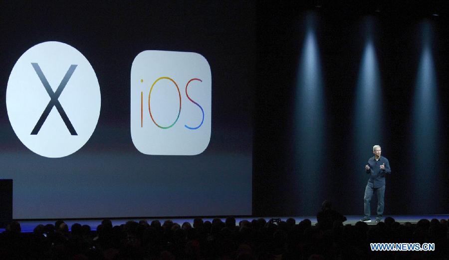 Apple's Chief Executive Tim Cook is seen on the company's World Wide Developers Conference (WWDC2014) in San Francisco, the United States, June 2, 2014. Apple kicked off its developers conference on Monday. (Xinhua)