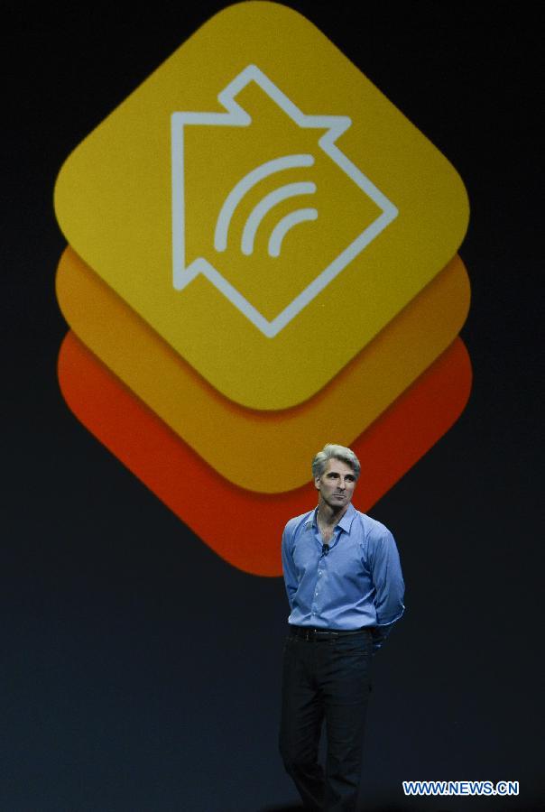 Apple's senior vice president of software engineering Craig Federighi speak on HomeKit on the company's World Wide Developers Conference (WWDC2014) in San Francisco, the United States, June 2, 2014. Apple kicked off its developers conference on Monday. (Xinhua)