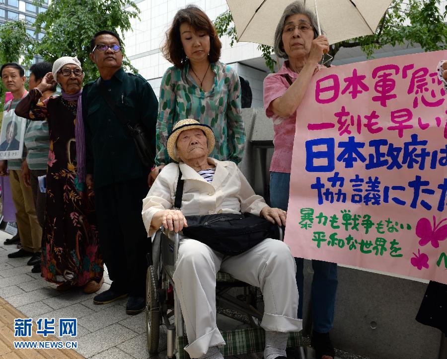 A former wartime sexual slave from South Korea, centre in wheelchair, join in a demonstration, demanding Japanese government to make a more explicit apology and compensation to the sexual slaves. (Photo/Xinhua)
