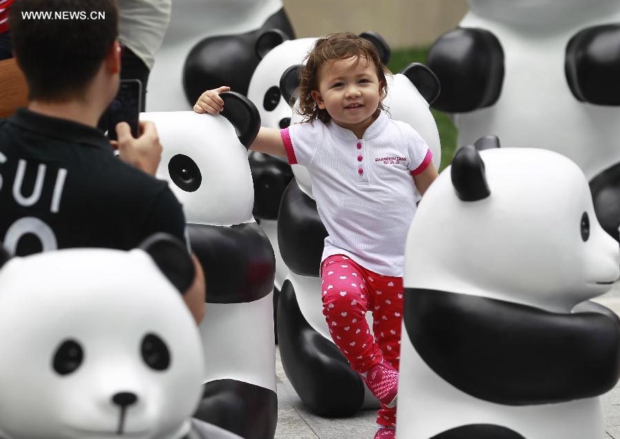A child poses for photos with lovely "pandas" during the "1St panda" exhibition at Kerry Center Square in Shanghai, east China, June 2, 2014. A total of 100 pandas made of leftover moso bamboos were displayed during the exhibition. (Xinhua/Ding Ting)