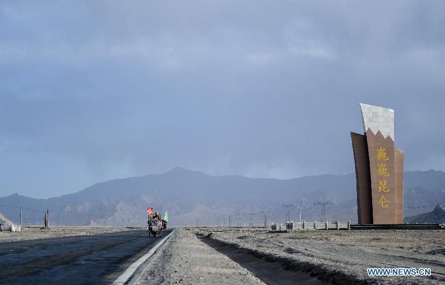 Li Zongtao walks past Nanshankou of Golmud city, Northwest China's Qinghai province, May 30, 2014. Li Zongtao, 47, was once a truck driver running on the Sichuan-Tibet Highway. He began the hiking tour of travelling around China in March, 2009, setting out from Southwest China's Chengdu city. During the tour, he made a living by selling bottles he colleted along the way. He has walked with his handcart across 26 provinces so far, trekking over 20,000 kilometers. [Photo/Xinhua]