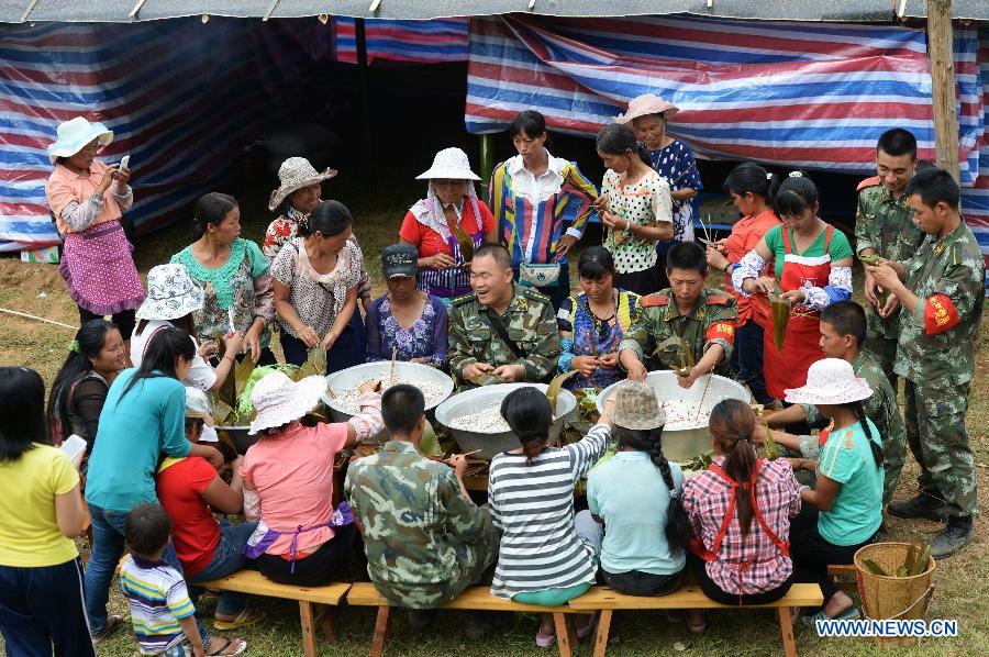 Armed police officers make Zongzi, a glutinous rice dumpling, along with earthquake-afflicted residents to celebrate the Dragon Boat Festival at a makeshift settlement in Hanxinlang Village under Kachang Town of Yingjiang County, Dehong Dai and Jingpo Autonomous Prefecture, southwest China's Yunnan Province, June 2, 2014. Yingjiang County was hit by a 6.1-magnitude earthquake on May 30 and a 5.6-magnitude one on May 24. The Dragon Boat Festival, also known as Duanwu, is celebrated annually on the fifth day of the fifth month of the Chinese lunar calendar, which falls on June 2 this year. (Xinhua/Hu Chao)
