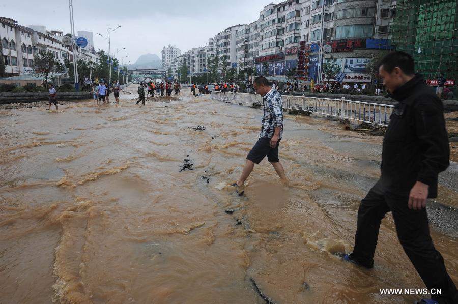 People wade through a waterlogged road in Pingba County of Anshun city, southwest China's Guizhou province, June 3, 2014. Heavy rain has battered most areas of Guizhou since Monday. (Xinhua/Ou Dongqu)