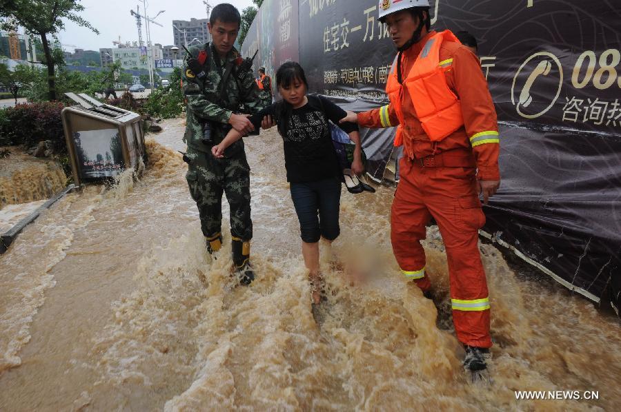 Rescuers escort a woman wading through a waterlogging road in Pingba County of Anshun city, southwest China's Guizhou province, June 3, 2014. Heavy rain has battered most areas of Guizhou since Monday. (Xinhua/Ou Dongqu)