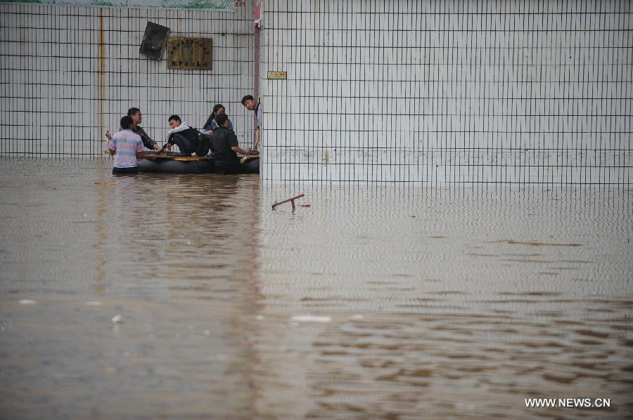 Rescuers transfer children trapped in a flooded elementary school in Pingba County of Anshun city, southwest China's Guizhou province, June 3, 2014. Heavy rain has battered most areas of Guizhou since Monday. (Xinhua/Ou Dongqu)