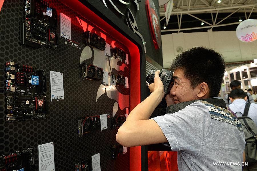A visitor takes photos of chipsets and GPUs displayed at the 2014 COMPUTEX Taipei, an international information and communications technology (ICT) show, in Taipei, southeast China's Taiwan, June 3, 2014. COMPUTEX Taipei is the largest ICT show in Asia. This year's COMPUTEX Taipei, opening on Tuesday, attracted more than 1,700 exhibitors, with the estimated visitor number exceeding 130,000. Deal oppotunities of billions of U.S. dollars will also be expected during the five-day event. (Xinhua/He Junchang)